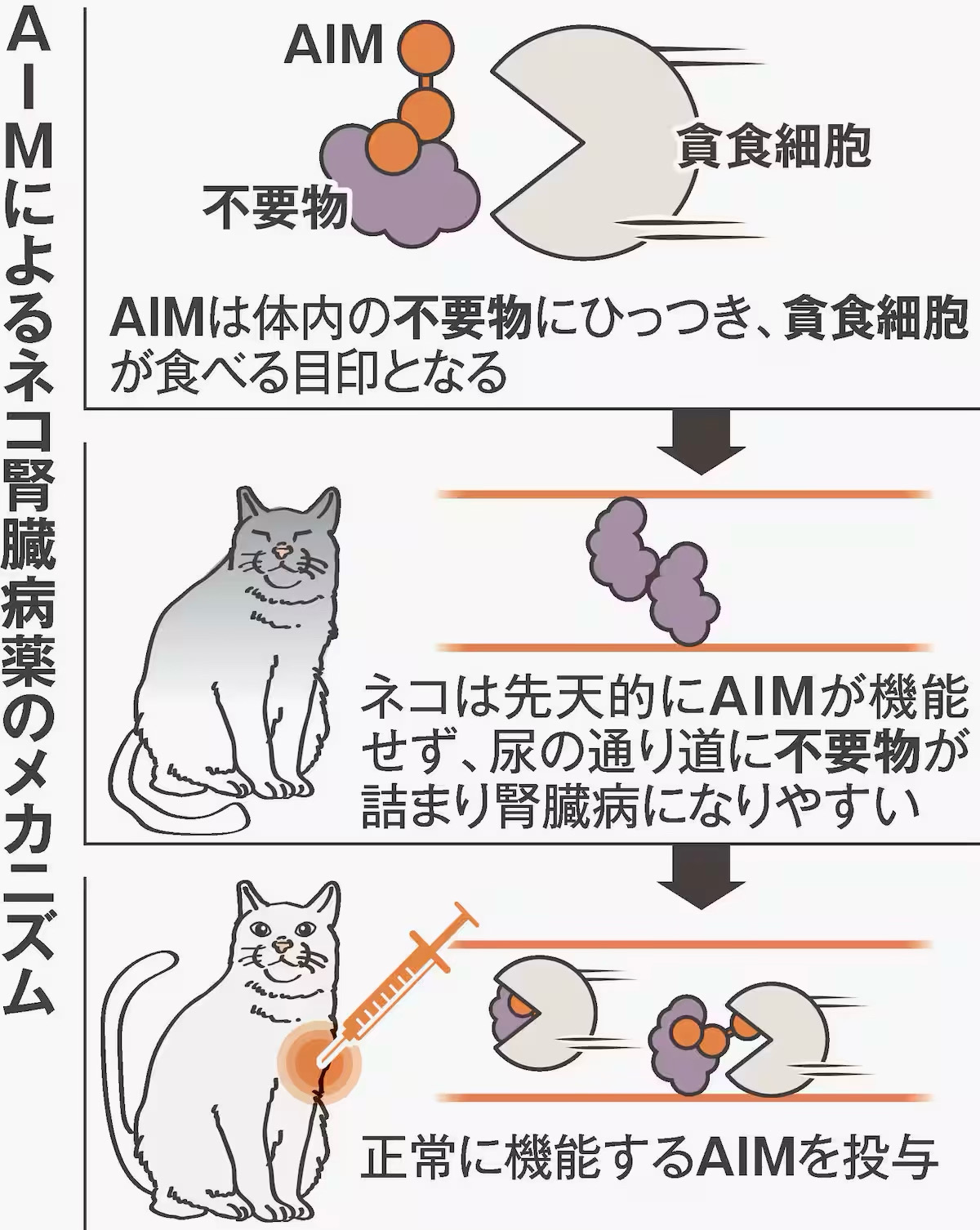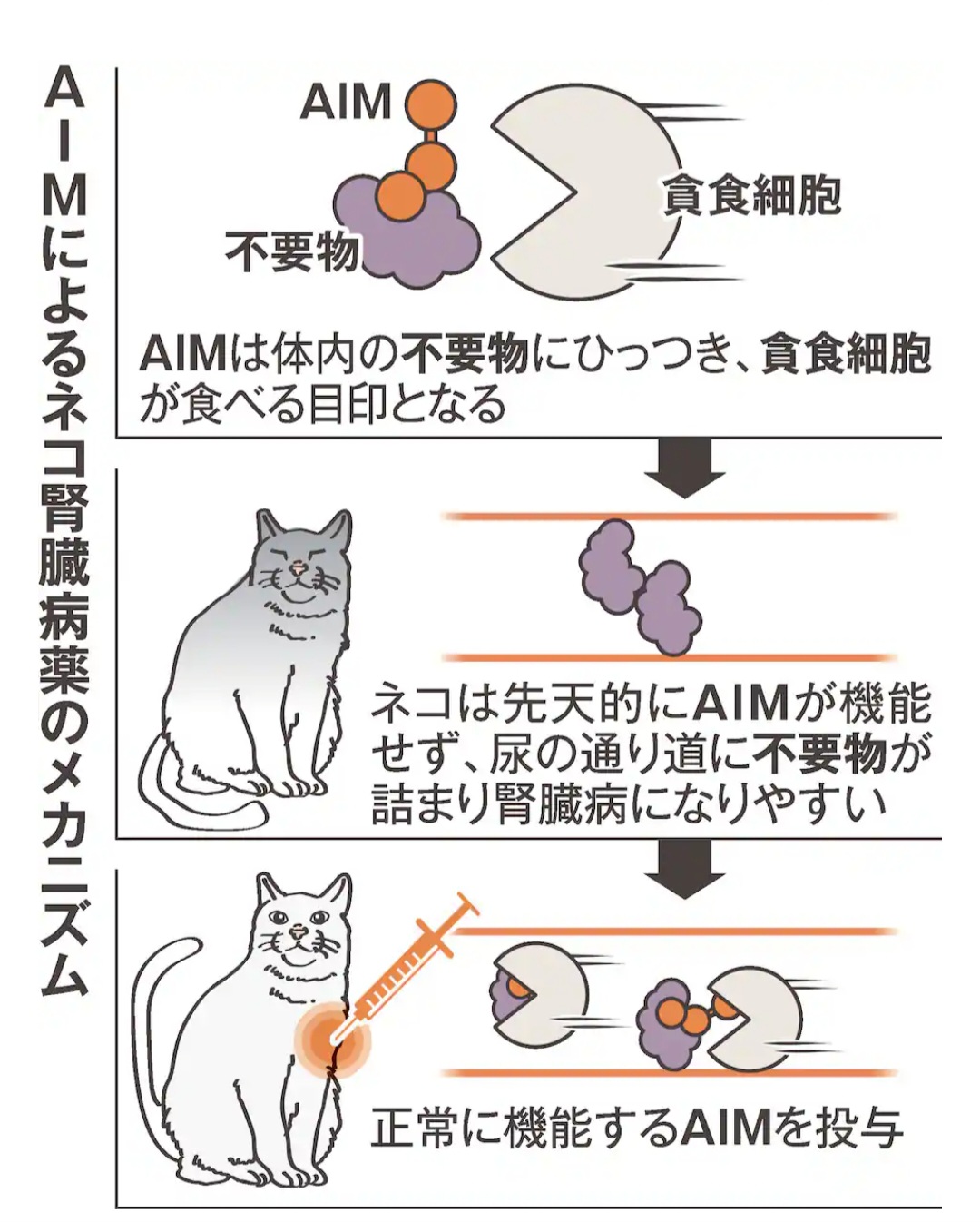 | … | 8326/01/07(水)17:53:34No.1390308621+>治験は4段階ある腎臓病ステージのうち、2番目に重い「ステージ3」のネコを対象に開発したAIM薬を2週間おきに数回投与。一番重い「ステージ4」に入ると通常は数カ月しかもたないとされるが、薬を投与したネコで病状の進行はなく、全身状態が改善。治験前に行っていた臨床研究での投与から元気に5年以上生存しているネコもいるという。 |