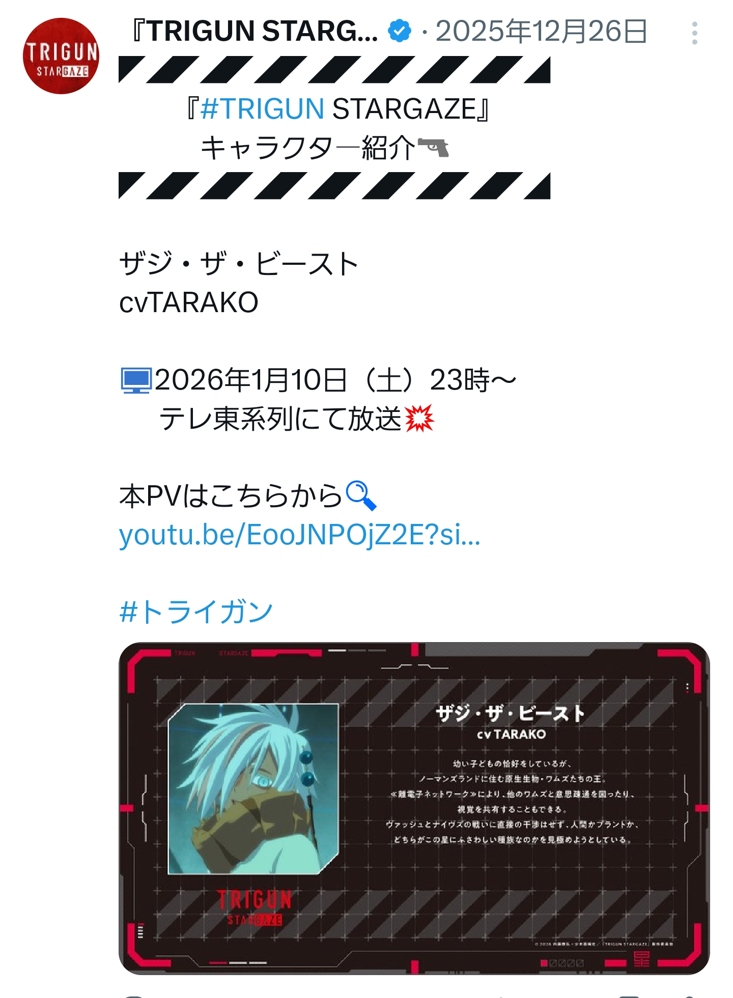 | … | 2626/01/08(木)01:37:54No.1390456512+トライガンはTVでもやるけど配信メインぽいしなー |