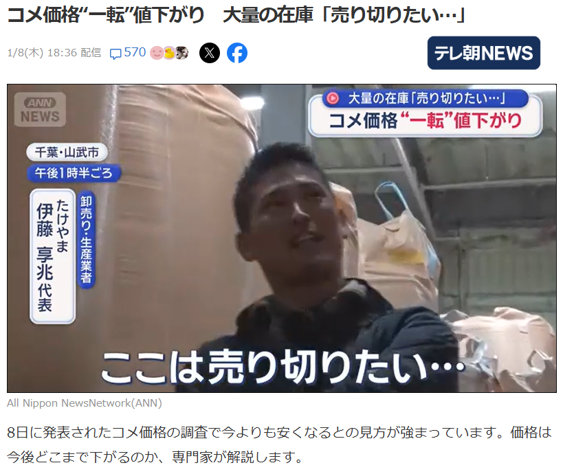 | … | 45026/01/08(木)23:22:02No.1390708958+米農家単体でみるというほど持久力内から、赤字だから売らないって構えてられなくて |