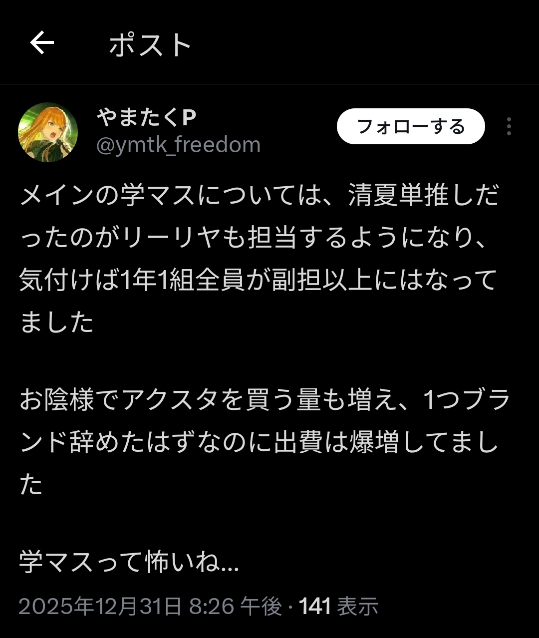 | … | 126/01/09(金)06:47:40No.1390760190そうだねx53ほんとに充実してるコンテンツはわざわざこんな事言わないのは学マス見てりゃわかるだろう |