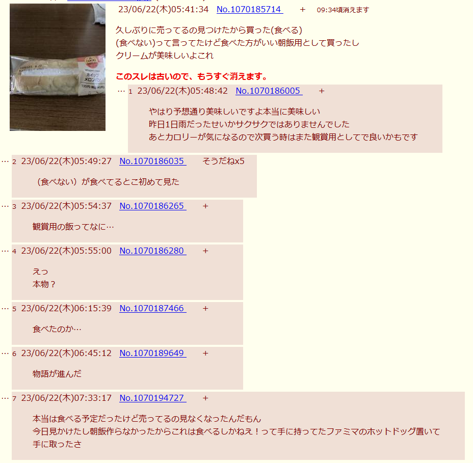 | … | 1626/01/09(金)22:05:35No.1390967484+彼女がホイップメロンパンを食べられる日は主治医から最後くらい好きなものを食べてもいいと言われた時 |
