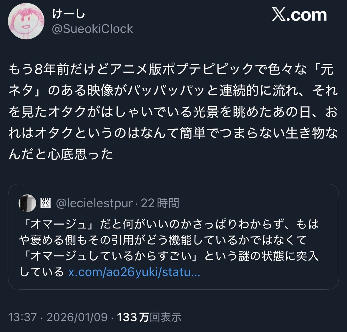| … | 30926/01/10(土)10:04:27No.1391079185+時々オタクが発作的にやる教養アピールの延長上にあると思う |