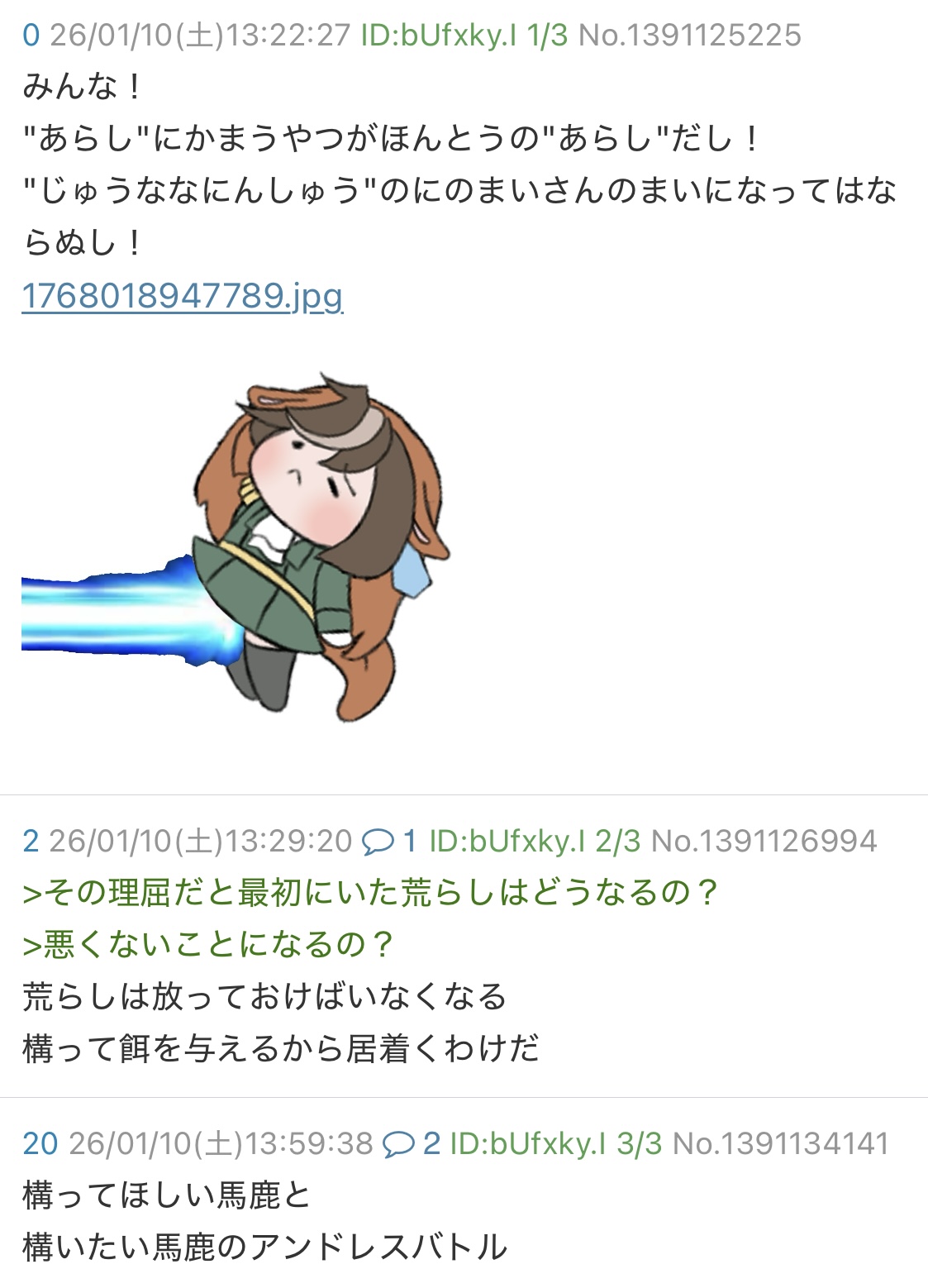 | … | 626/01/10(土)14:18:26No.1391138737+いつもスレ「」を援護してくれる正義の味方さん遅いな… |