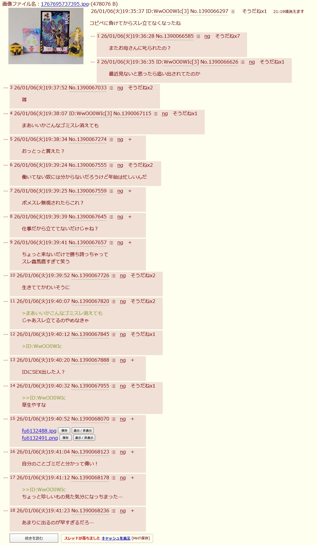 | … | 4226/01/10(土)16:38:23No.1391171707+せっかく面白いID出た時はスレ消すんだよね |