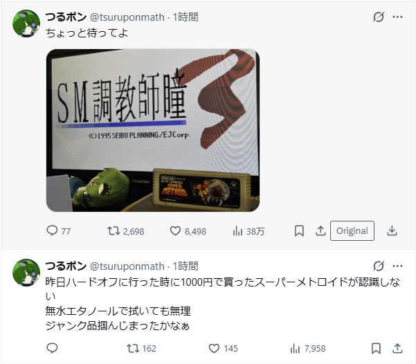 | … | 7726/01/10(土)17:01:47No.1391177523+スーパーメトロイドあげるから交換してほしいわ |