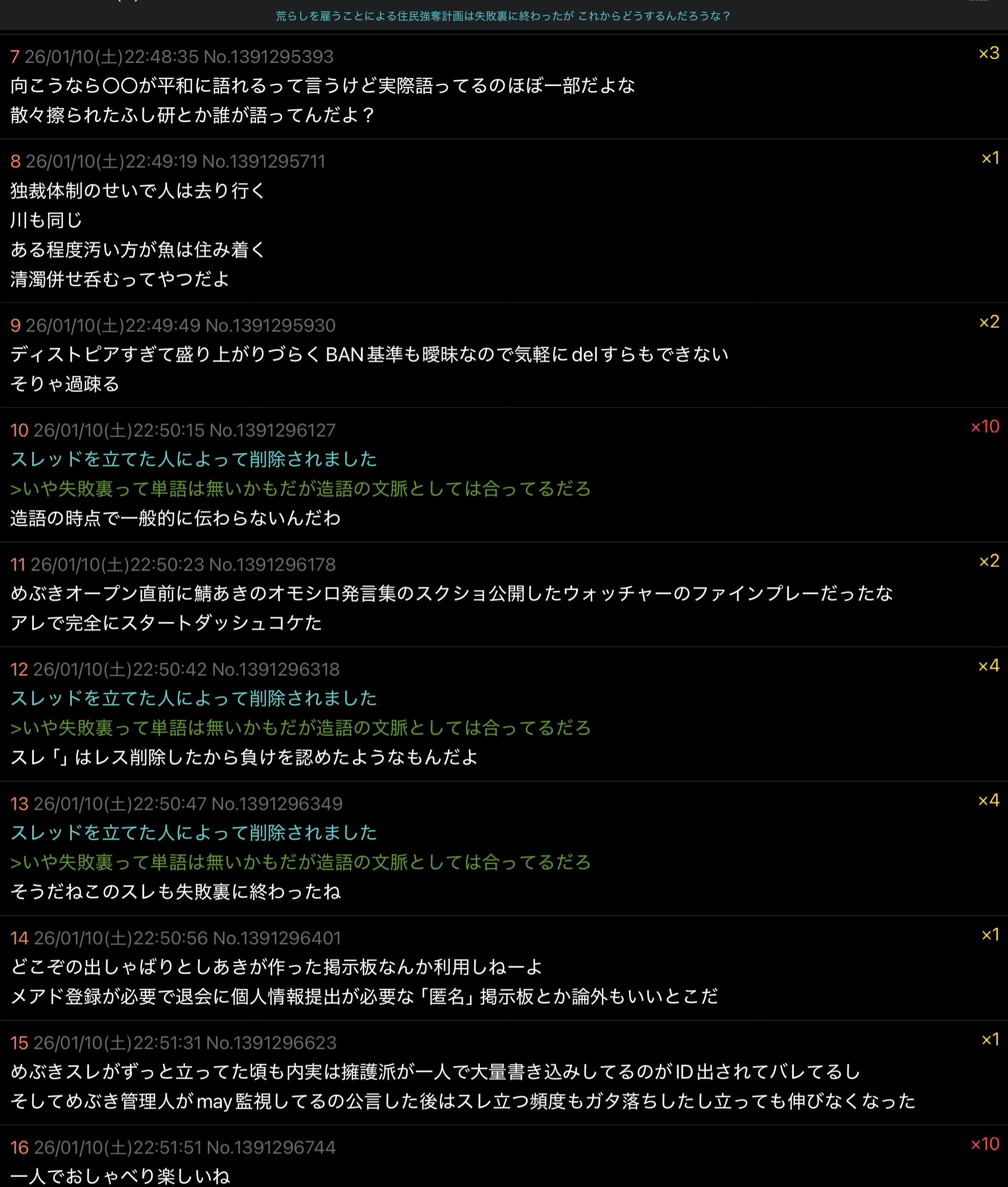 | … | 1926/01/10(土)23:00:05No.1391299815+めぶき叩きスレを立てるも日本語のおかしさを指摘されまくって恥ずかしさで爆破して |