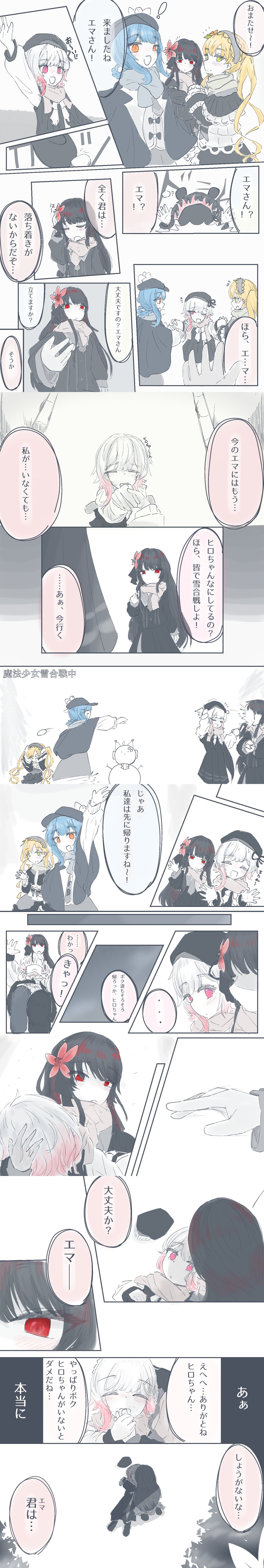| … | 8826/01/10(土)23:14:31No.1391305439そうだねx8実際のエマはハンナちゃんに教えてもらいながらマフラーを頑張って編むけど当日みんな立派なプレゼントをいっぱい送ってるのを見て、こんなのもらってもヒロちゃんは着けないよね…ってプレゼントを後ろ手に隠しながら悲しそうに笑って準備出来なかったから今度ちゃんとプレゼント持ってくるね!ってウソを吐こうとするんだ… |