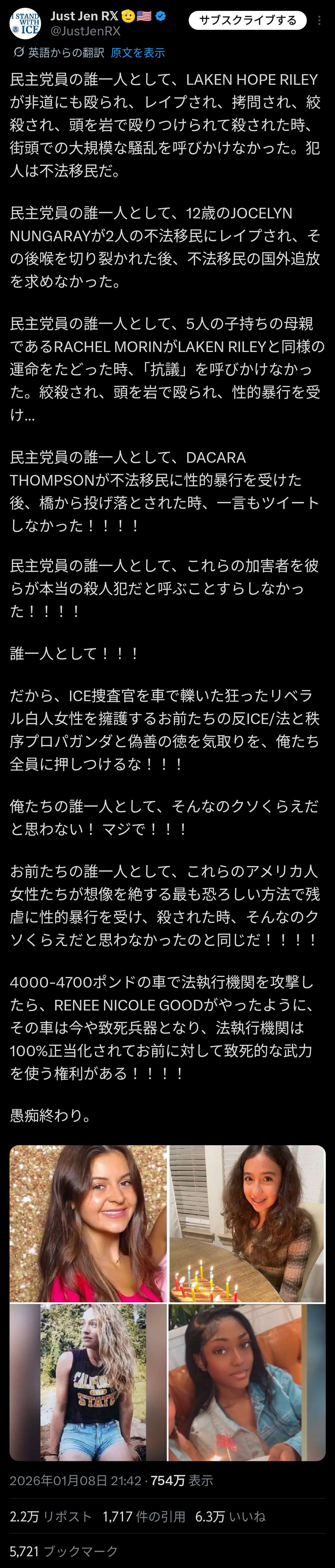 | … | 6126/01/11(日)02:19:23No.1391358335そうだねx2>ICEの警告も無茶苦茶だし警察官はこれくらいじゃ発砲しないに対してICEはまともな訓練など受けてないので被害者が考慮しなくちゃいけないってエクストリームな擁護を某SNSで見た |