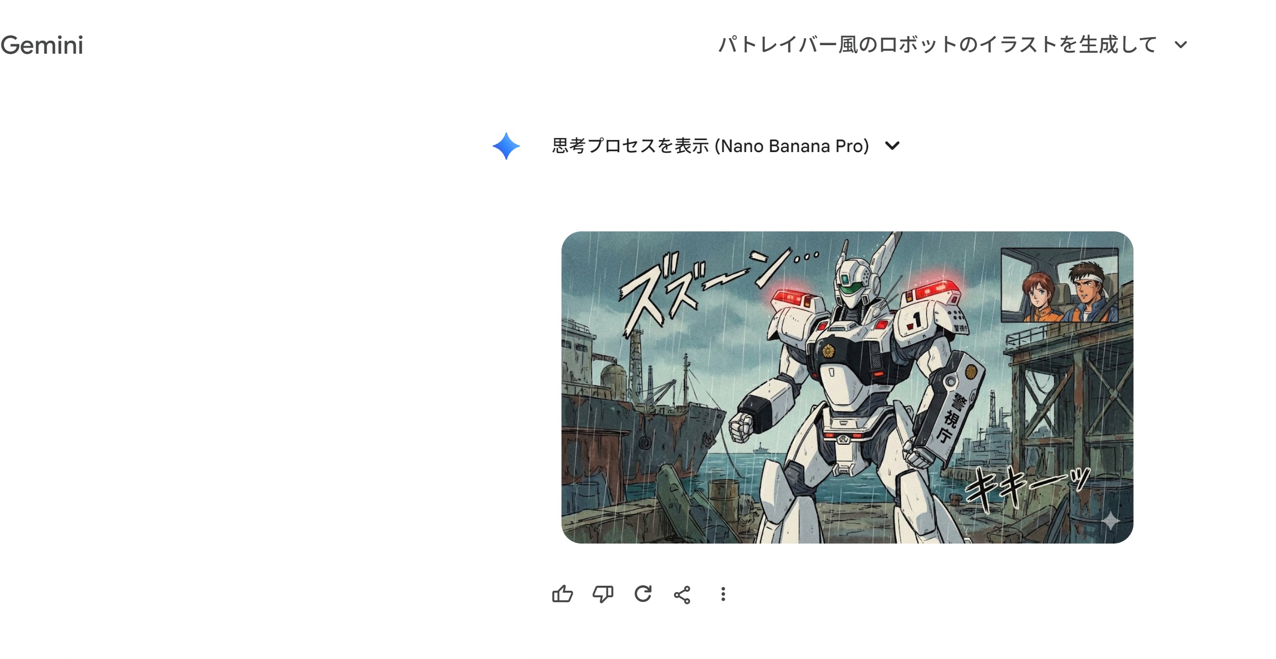 | … | 4726/01/11(日)17:10:15No.1391523307+俺もグロック君に描いてもらったガンダム風のイラスト生成してって言うだけでこいつ出てくるのすげーなって |