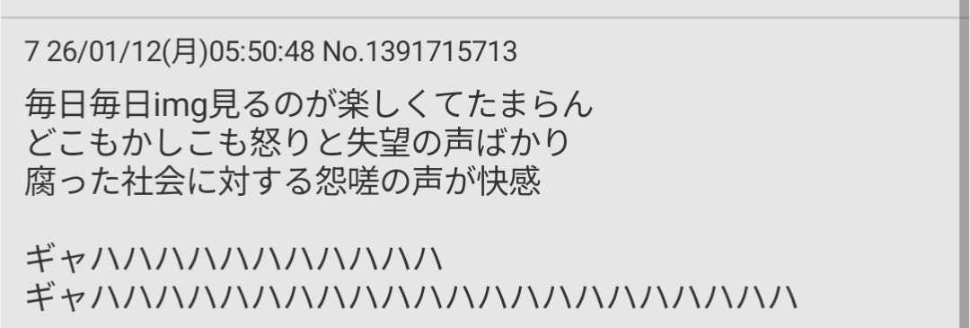 | … | 1426/01/12(月)09:57:51No.1391740739そうだねx1>今の荒らしは境界知能のおっさんが喚いてるだけで面白くもなんともないもんな… |