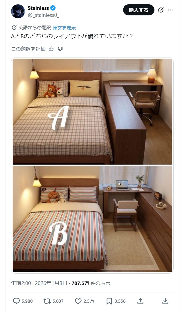 | … | 12026/01/12(月)12:36:45No.1391774999+ベッドの上に羽毛布団乗せること考慮したらB一択にしかならんのよ |