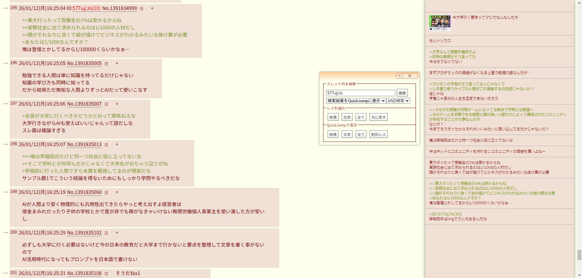 | … | 5126/01/12(月)15:50:23No.1391826028そうだねx4AI使いこなせます!って自信満々に自己アピールしてくる中卒と |