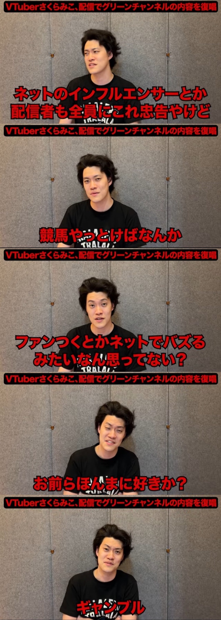 | … | 40026/01/12(月)21:35:47No.1391937976+>「Vtuber」とか「バラエティ出る声優」とか「競馬する配信者」とか結局具体的に誰?ってのは明かさないし、暗にこいつって察せる情報も出さないから |
