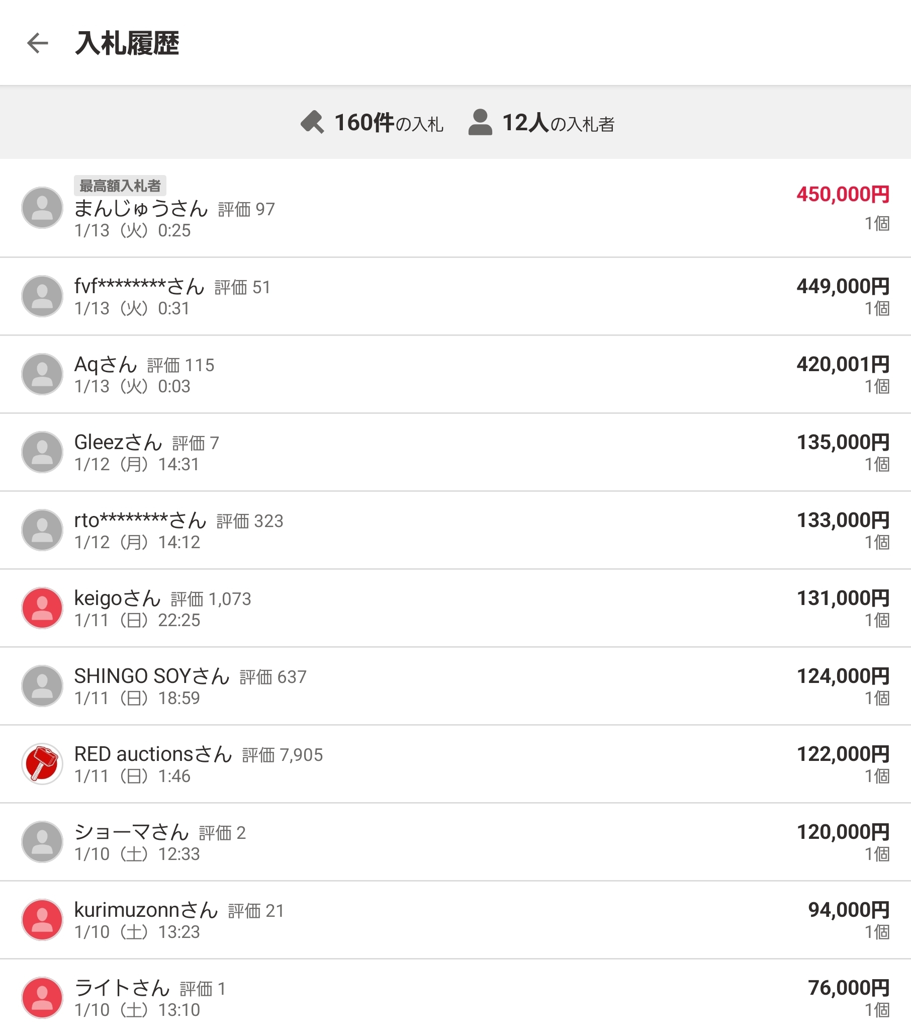 >入札履歴見たら12人で殴り合ってた