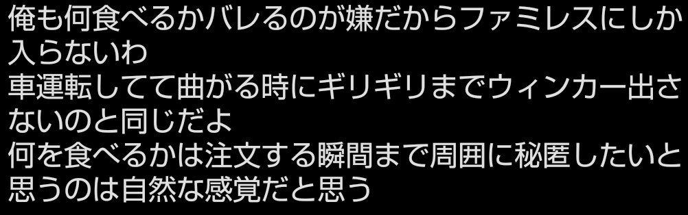 | … | 11526/01/13(火)00:38:29No.1392007946+>食べるところ見られたくないのにファミレスはOKってどういうルールなんだよ… |