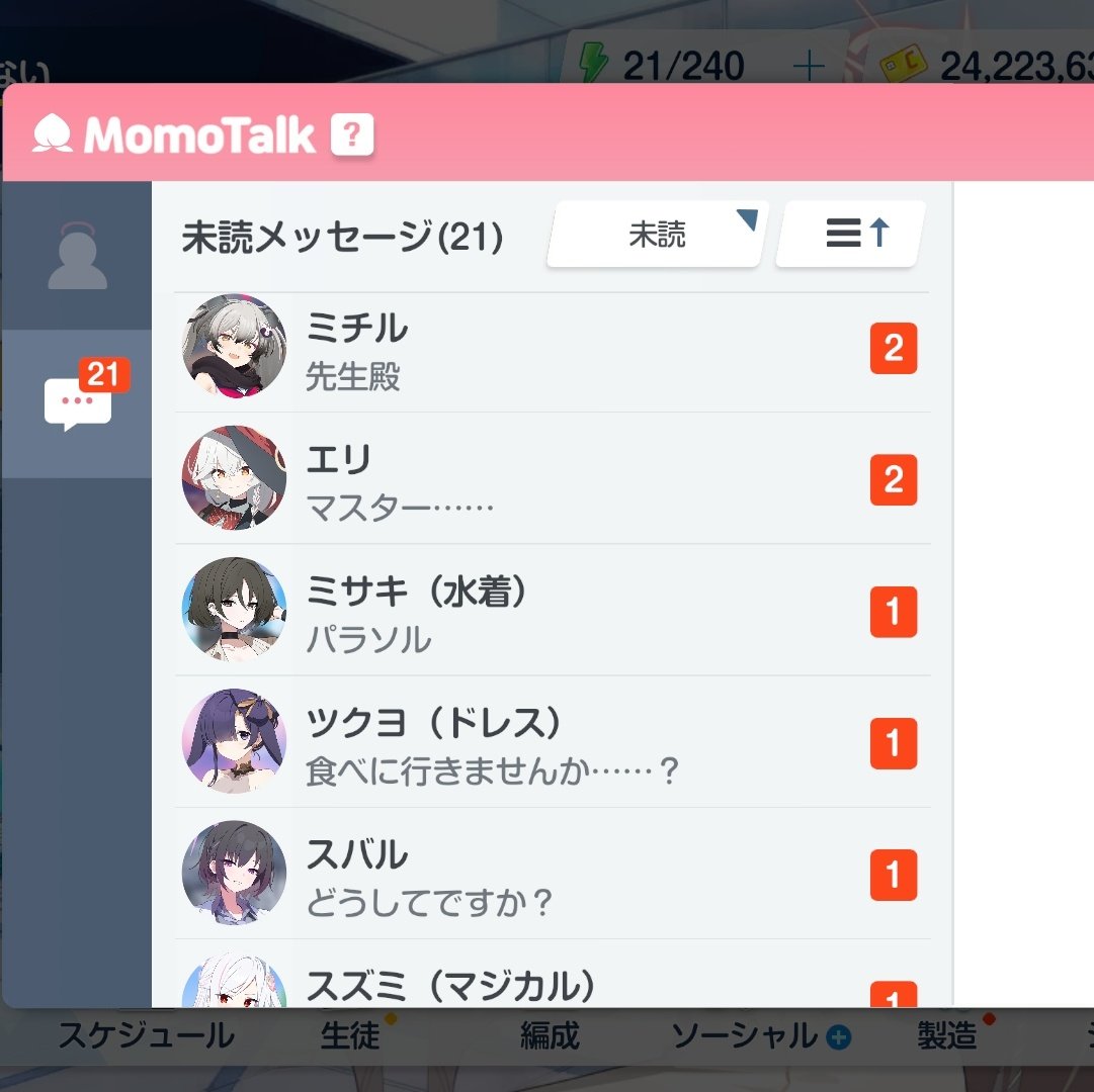 | … | 35626/01/13(火)08:46:20No.1392043010+>こっちからモモトーク送れる機能あってもいいよな |