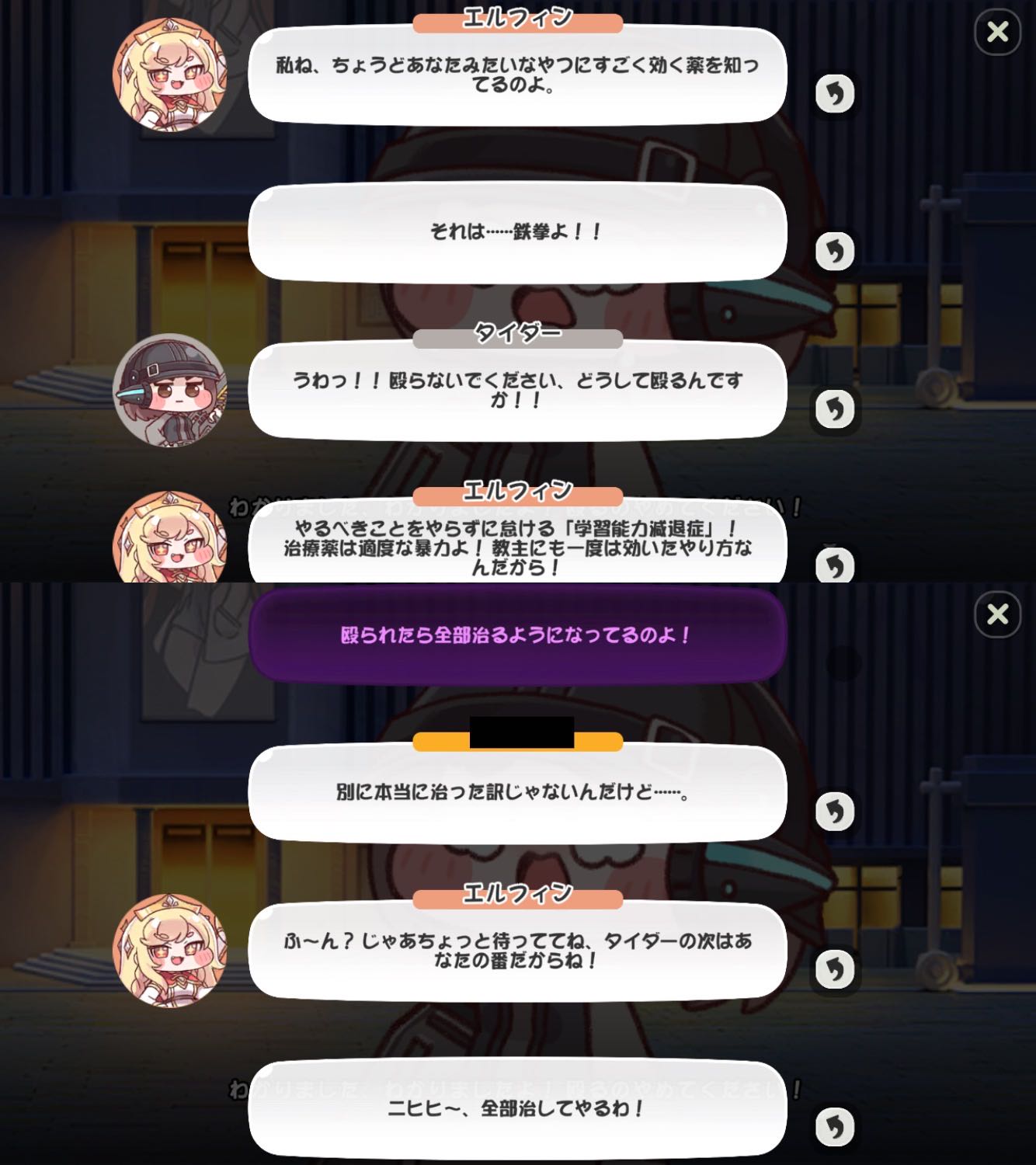 | … | 71626/01/13(火)11:17:33No.1392064370+>翻訳はもう少し何とかしてほしいけどきっちりしすぎると味が薄くなるのかな ぶっちゃけ改行が変だから違和感倍増してて改行さえなんとかなったら変な言い回しは味だと思うわこれ |