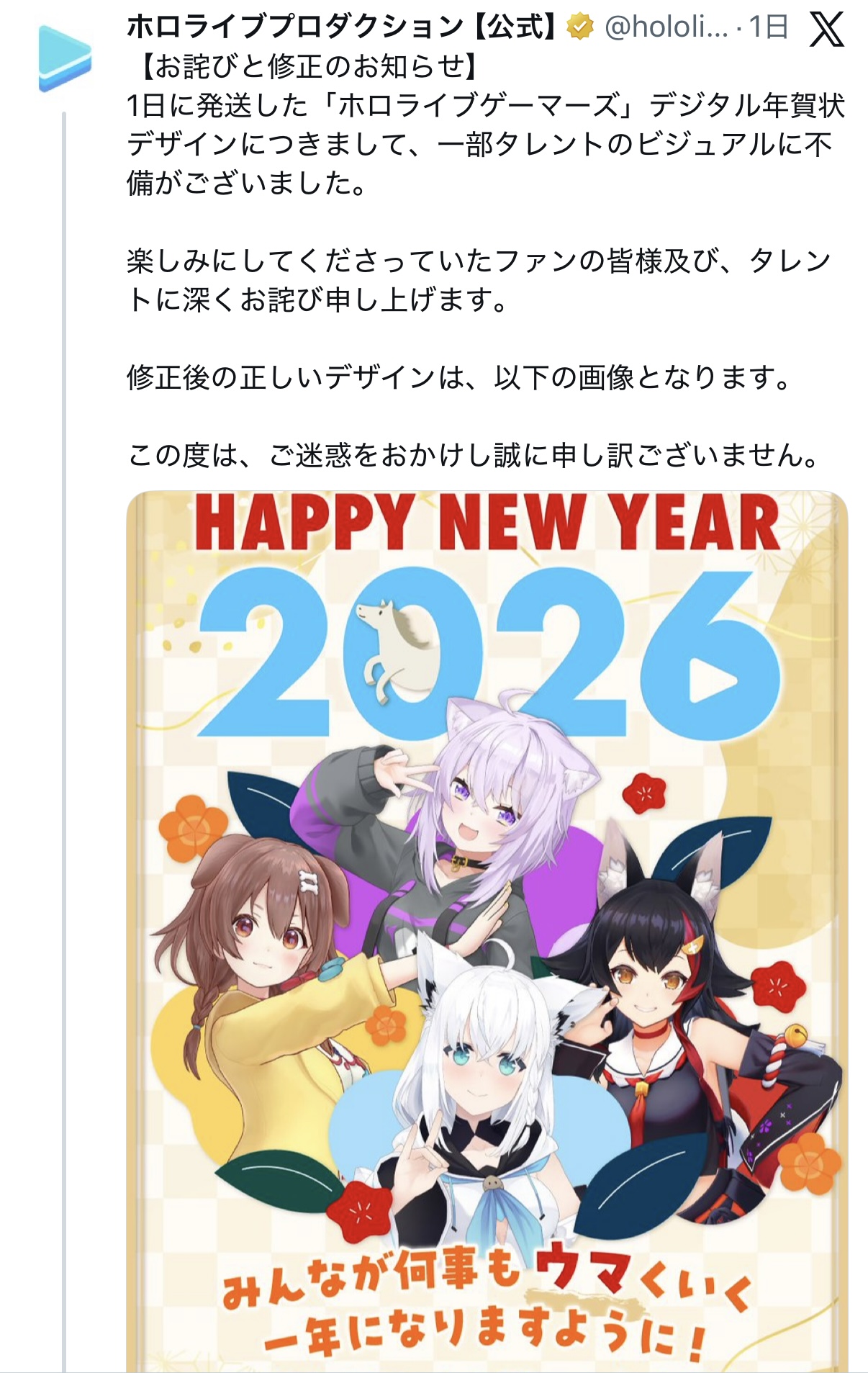 | … | 2126/01/14(水)12:06:46No.1392360837そうだねx4>手元に来るグッズですらないただのデジタル年賀状程度のものでもちゃんと修正してくるんだな |