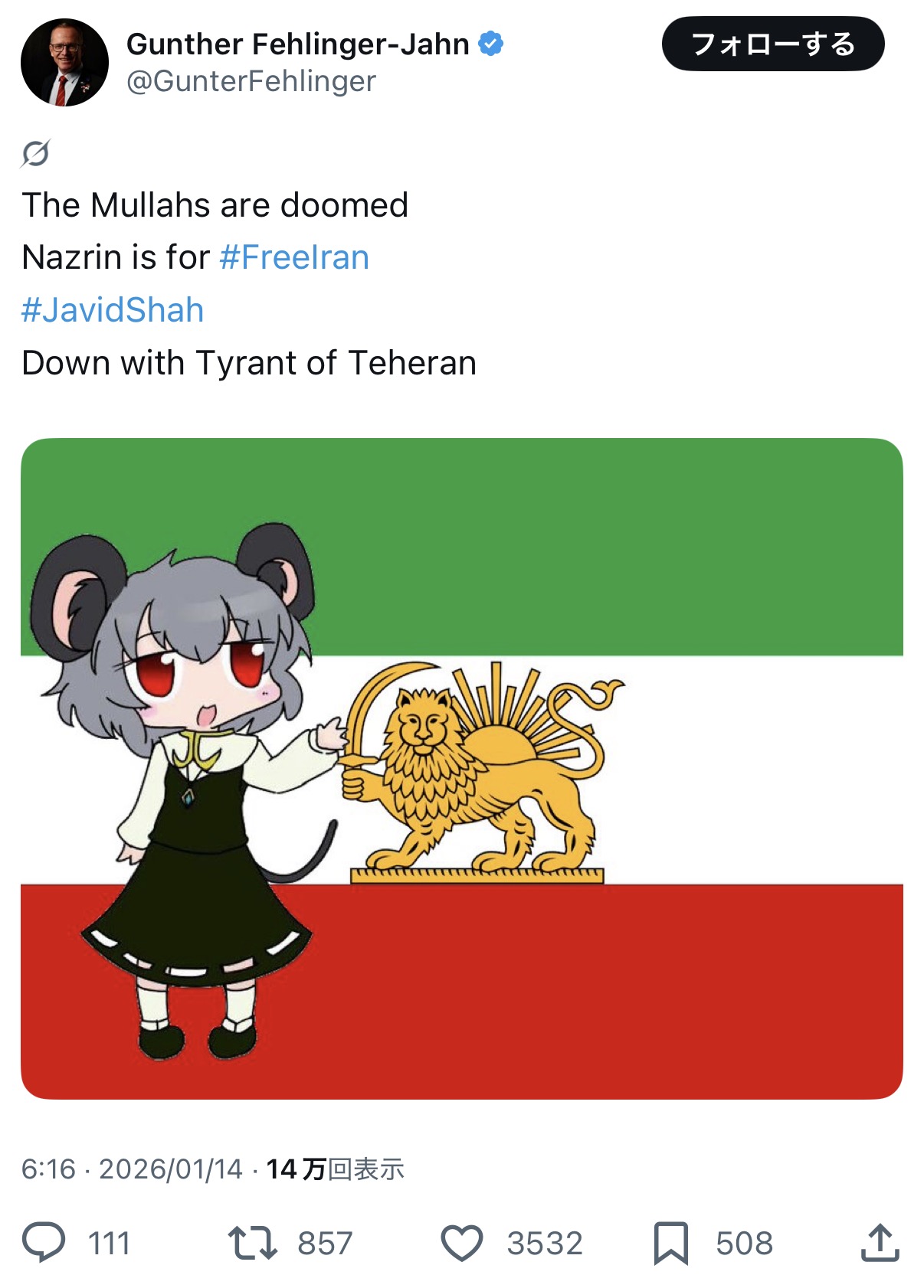| … | 6826/01/14(水)17:19:06No.1392425500+スレ画の人は別にイランの人じゃなくない? |