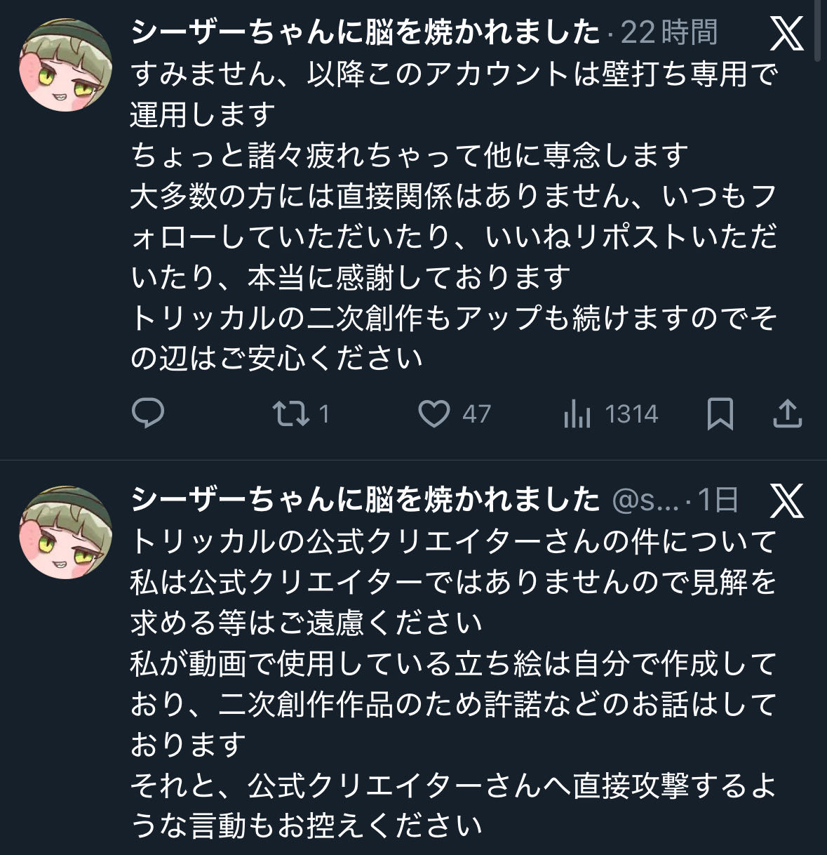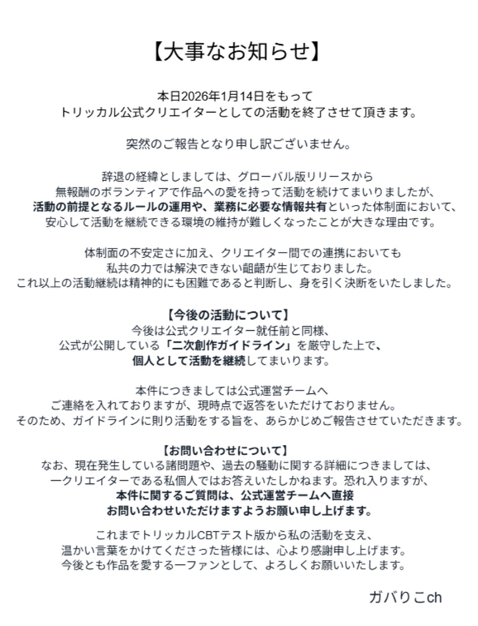 | … | 41926/01/14(水)18:15:56No.1392439469+厄介な自称クリエイターが自分から離れていってくれるなら公式としては一安心なのでは |