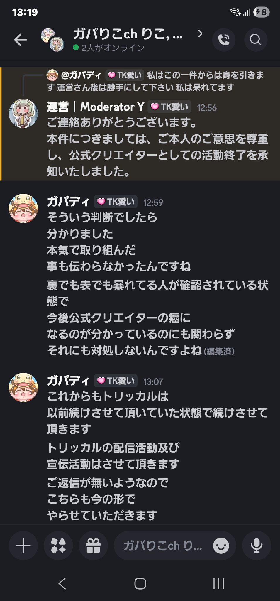 | … | 826/01/14(水)16:21:18No.1392413978+なんか公式discordの空気がよくないとかは聞いたけど荒れてんの? |
