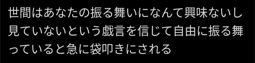 | … | 626/01/14(水)15:21:50No.1392402881+自意識過剰だよなという意識とお天道様が見ているぞという意識を同時に持つんだ |