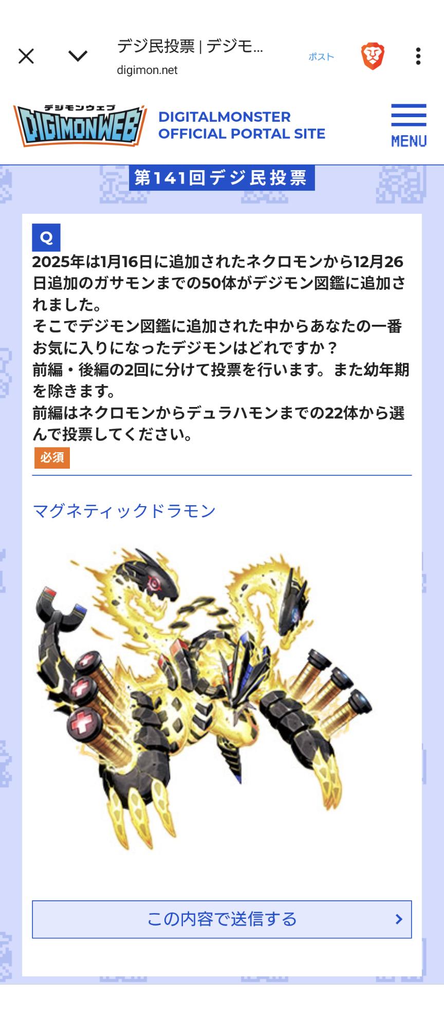 | … | 1026/01/14(水)18:23:29No.1392441541+俺のハートはマグネティックドラモンに投票しろと言ってるがチンポがアリエモンにしろと言っている… |