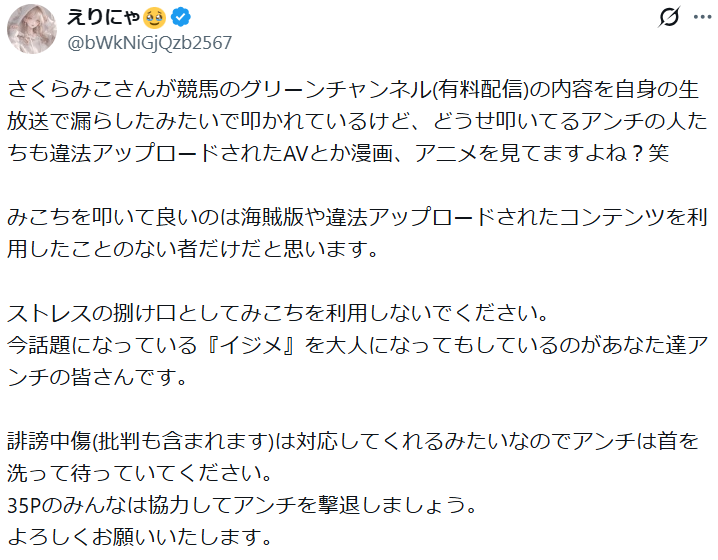 | … | 3626/01/14(水)18:32:59No.1392444094そうだねx15ローレンAV割りバレの時に不正ダウンロードみんなしてる!って擁護してたにじリスがクソほどバカにされてたの悔しかったのかよ… |
