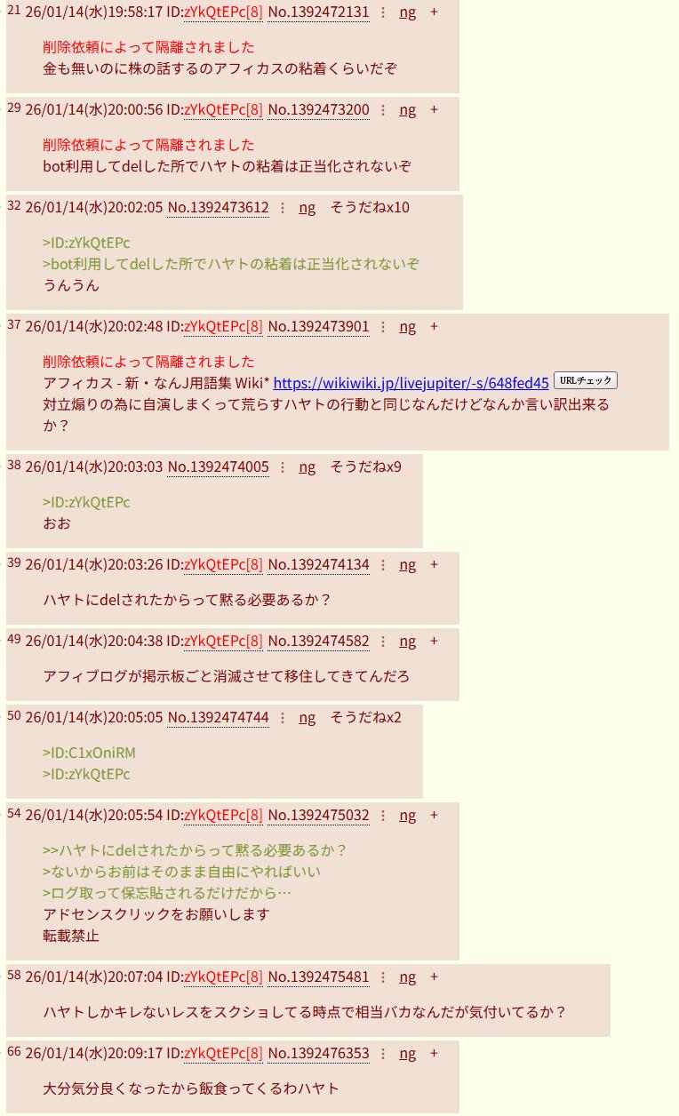 | … | 4826/01/14(水)20:04:35No.1392474564そうだねx9>ハヤトにdelされたからって黙る必要あるか? |
