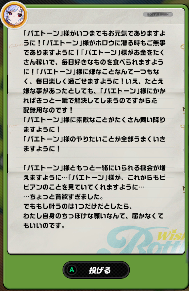 | … | 3826/01/14(水)22:37:23No.1392530654+>ビビアンの文章長いけど切実だったから好感度上がってしまったンナ |