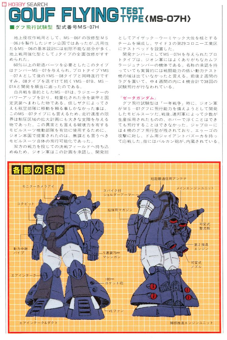 | … | 2126/01/15(木)07:53:54No.1392599771+>MS-07グフに飛行能力を与えたバリエーション機。もともとグフは、開発段階から「重爆撃機ド・ダイYSの背に載せて行動範囲を広げる」という運用を想定されていたが、一方で機体そのものを飛行されるプランも検討されており、07Hの開発ナンバーを持つ多くのテスト機が開発されていた。その多くは、満足な性能を得られないばかりか事故を頻発する欠陥機であったが、最終形となるこのH8型に至り、脚部と腰部の熱核ジェットエンジンによって安定した飛行性能を実現。ごく少数が量産され、チベットのラサ基地にもアプサラスの護衛機として配備されていた。もっとも、さすがに航続距離や機動性は望むべくもなかったようで、MSの飛行プランは本機を最後に途絶。機動性と行動半径の拡大という命題は、MS-09ドムの熱核ホバーによる高速移動へと引き継がれた。 |