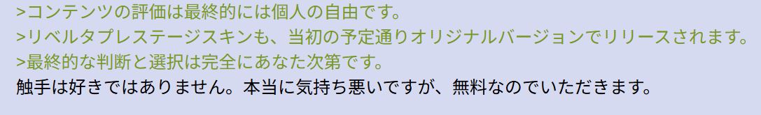 | … | 9326/01/15(木)07:57:26No.1392600122+まぁスキン買ったことなさそうな人にも触れる機会になっていいことだ |