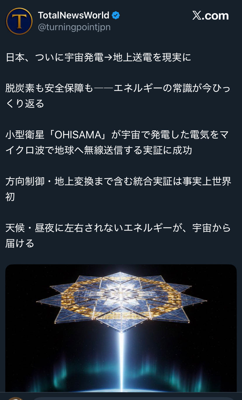 | … | 6226/01/15(木)12:31:39No.1392644739+無線送電に関しては結構前から地球上で実証実験してたからな |