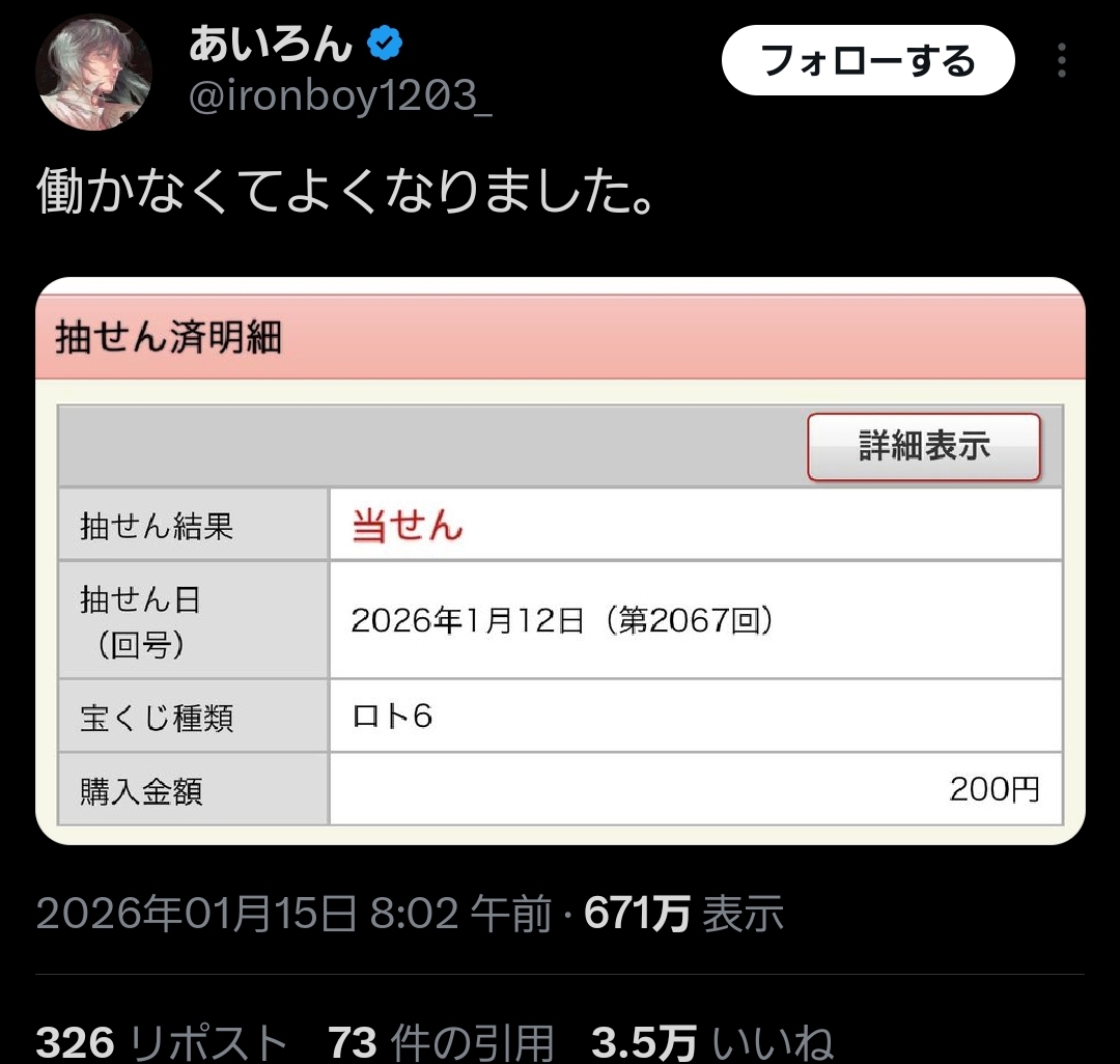 | … | 4526/01/15(木)18:18:04No.1392719881+キャリーオーバーしてるのに気づいた時だけ1口2口買ってるけど前に1万円当たったので今んところ収支プラスで気分良くやってる |