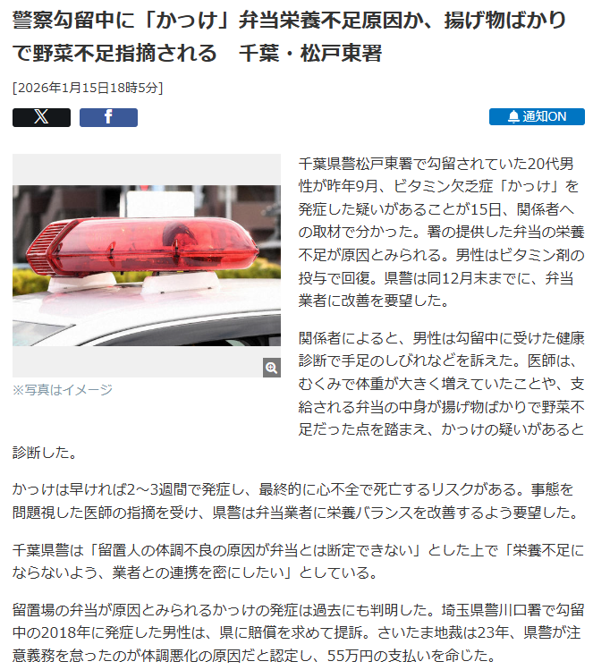 留置所は極端な言い方すると板チョコだけチュモンして食べるとか出来ちゃう自由かつ自腹の食事だからこういうことが起きる