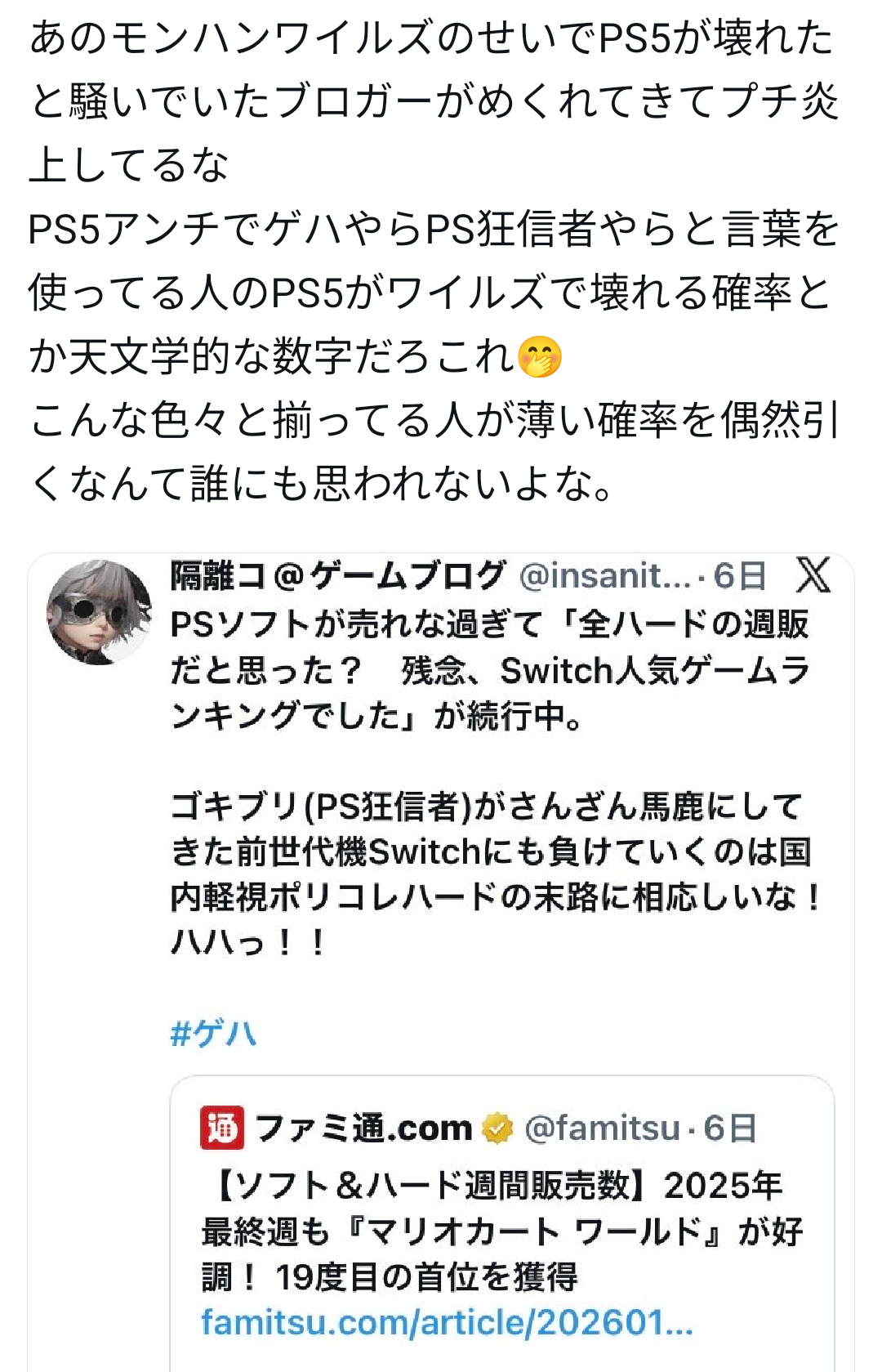 | … | 6426/01/16(金)17:18:53No.1392985826+>スレ画の人に粘着してもワイルズがPS5を破壊した事には変わりないぞハヤト! |