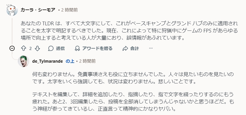 | … | 8926/01/16(金)19:11:48No.1393015501+>発見して教えてもらわなかったらアンチチート改善したのにずっとユーザーが重いとかわけわからん文句言ってんな…ってなったままなんだろうな |