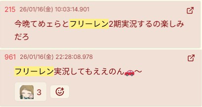 | … | 2026/01/16(金)22:49:08No.1393108053+>>みんなフリーレン実況しよ |
