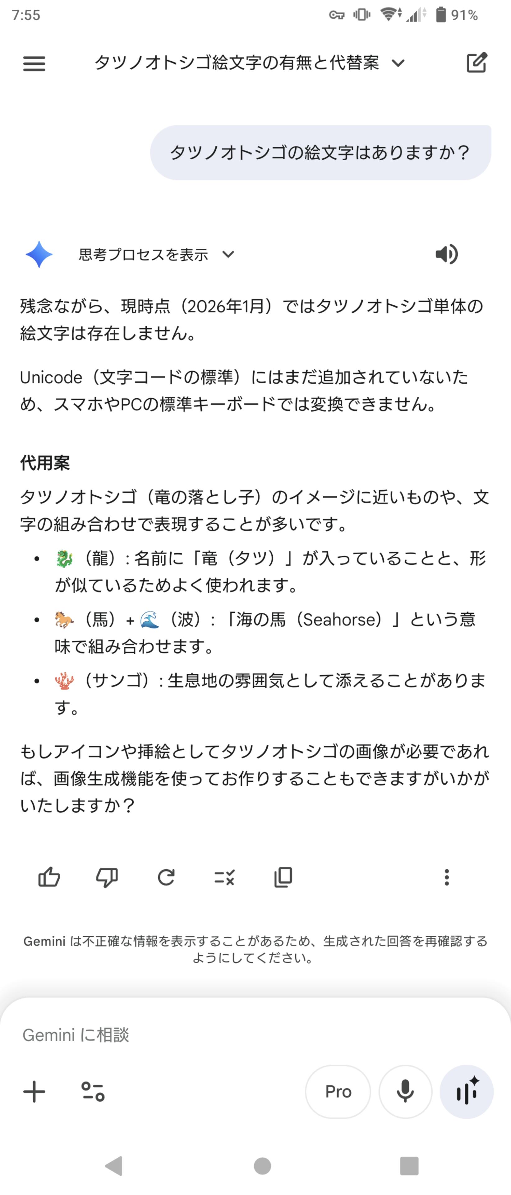 | … | 9526/01/17(土)07:56:36No.1393186970+>gemini3.0になってもタツノオトシゴの絵文字で混乱するんだな… |