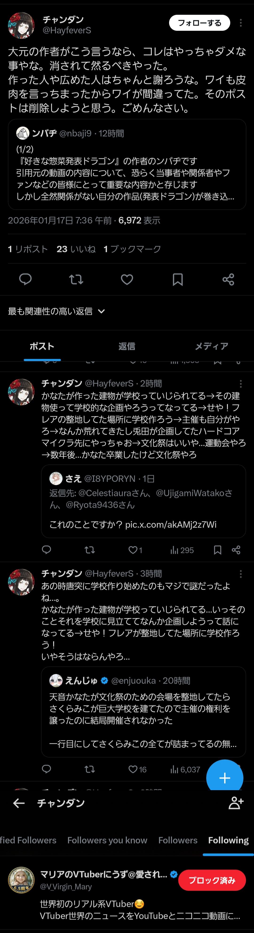 | … | 53126/01/17(土)13:02:26No.1393251147+>まずそもそも声明の表題が「【注意喚起】当社所属ライバー以外の配信者・タレントの活動を妨害する行為について」となっていて外部へ攻撃すんなが主題なんだから小柳ロウ関係がメインなら頭おかしくなってんじゃん |