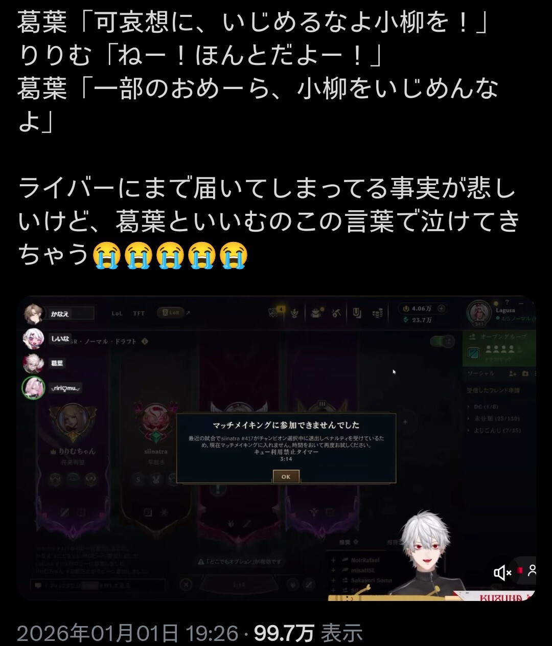 | … | 4726/01/17(土)11:41:54No.1393228530そうだねx8遅かれ早かれではあったからにじさんじが悪いとまでは言わないけど |
