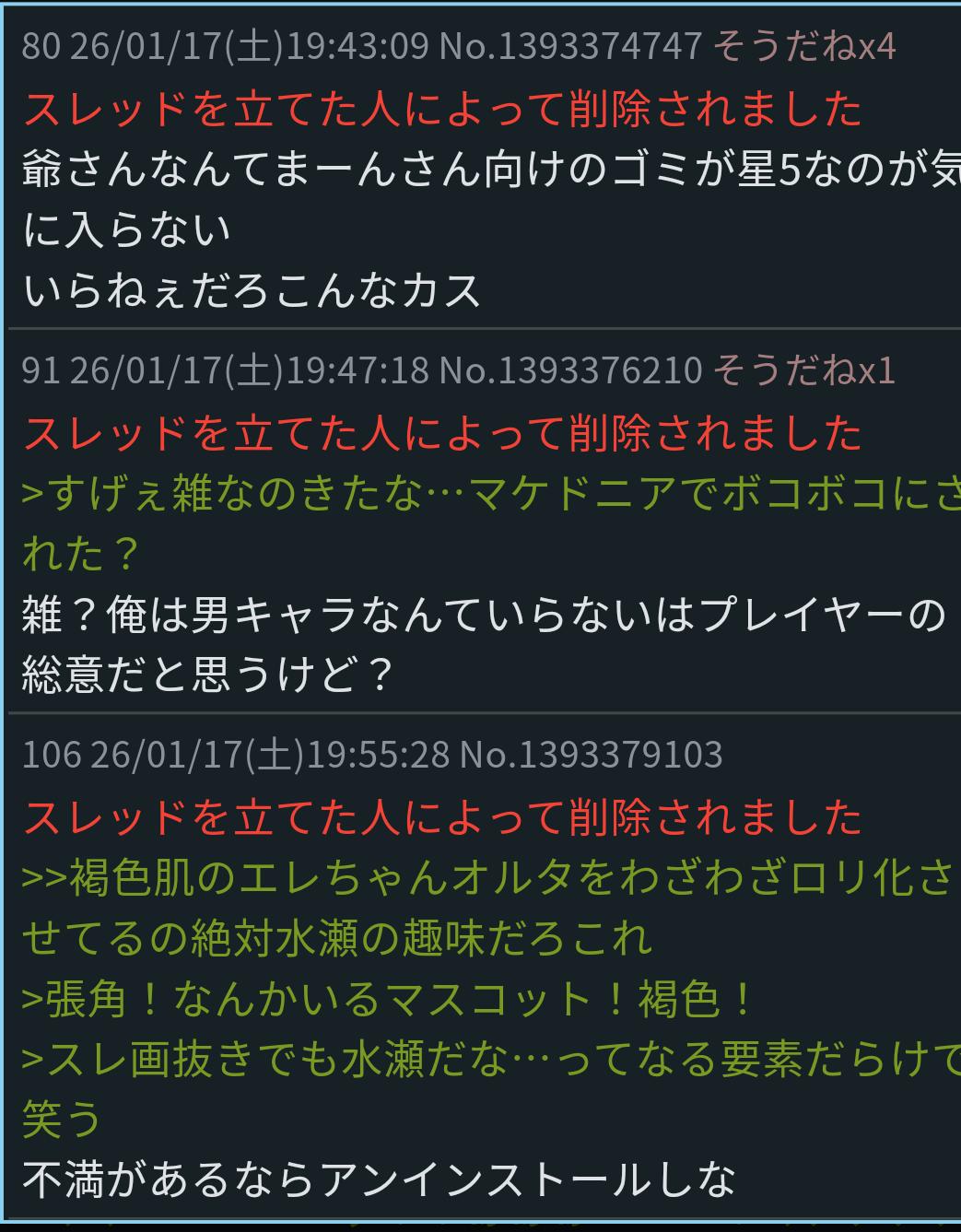 | … | 326/01/17(土)19:38:04No.1393372878そうだねx8架空の荒らしとか言ってんのもたいてい本人だろうし |