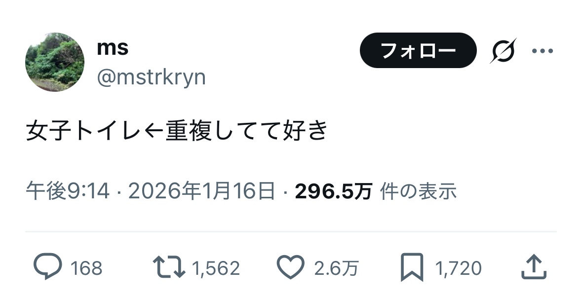 | … | 126/01/18(日)01:25:03No.1393501683そうだねx8男子トイレ←重複してて好き |