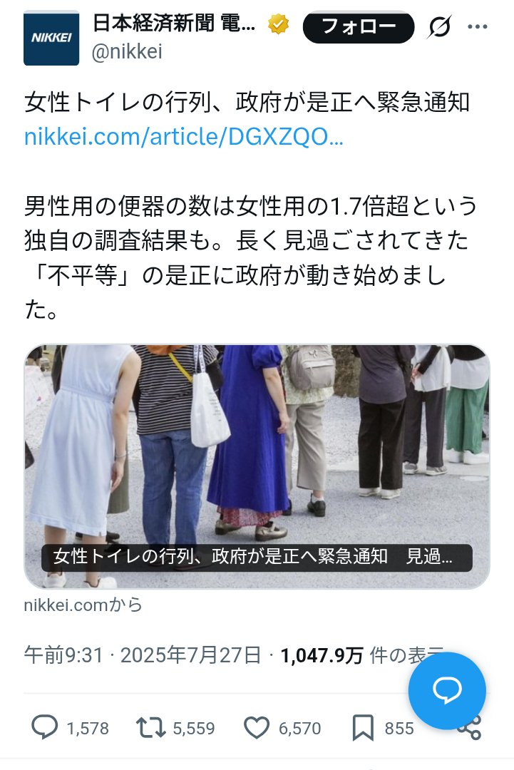 | … | 3326/01/18(日)09:57:02No.1393556463そうだねx16単に女子トイレ増やしてほしいじゃなくてなぜか男子トイレから奪うのが前提なんだよな |