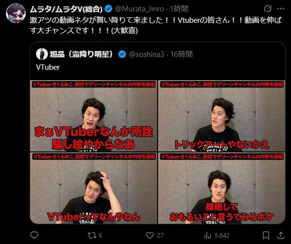 | … | 6726/01/18(日)12:18:24No.1393595457そうだねx16>Vtuberの荒らしってあんまりimgで見かけない口調だからすごい浮くな… |