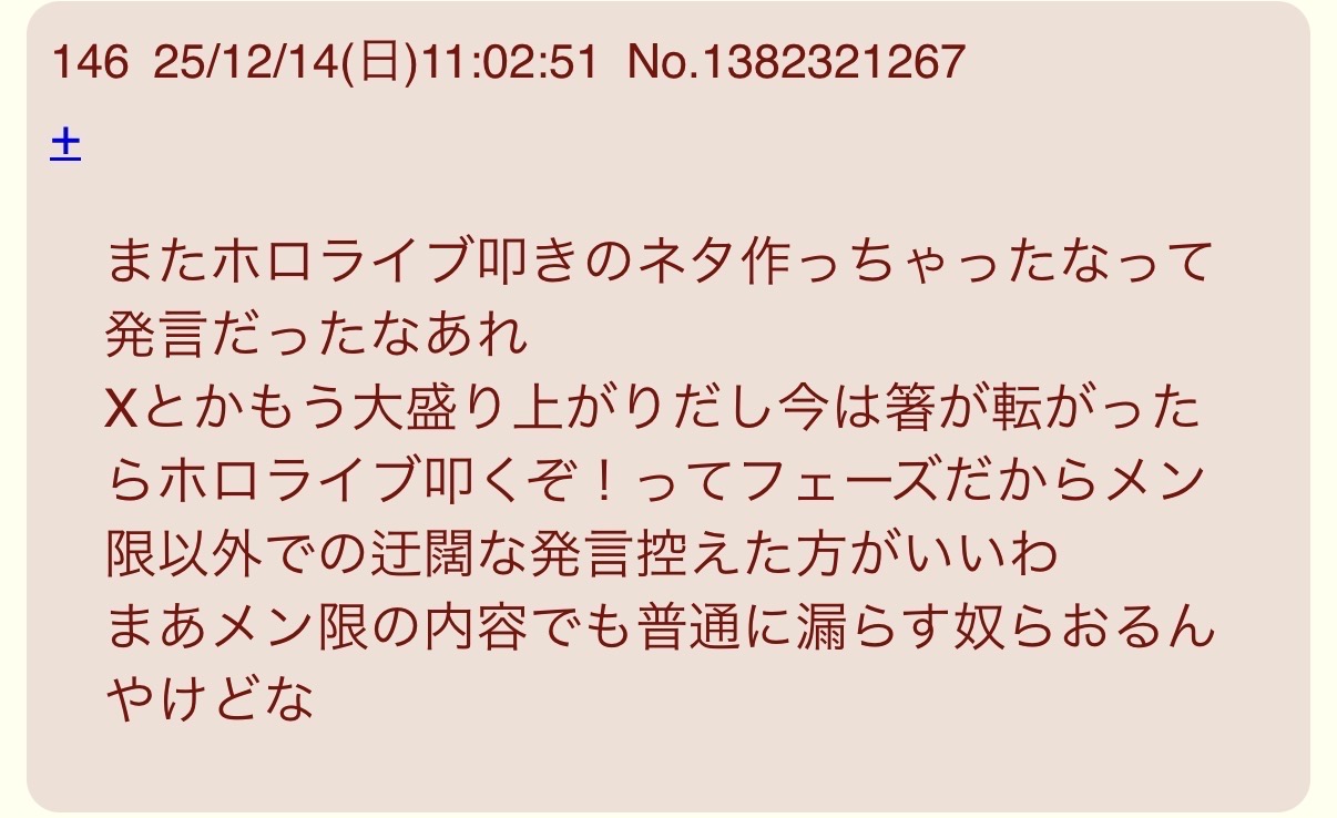 | … | 426/01/18(日)14:28:01No.1393634009そうだねx7>ホロライブに一方的に粘着してるのはにじさんじリスナーの方なのにそれを批判してる方が荒らし扱いされてるのずっと納得いかない |