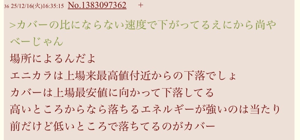 | … | 3026/01/18(日)14:36:19No.1393636212そうだねx1>にじ実況スレまで乗り込んできてスレ潰そうとするのは違うような気もする |