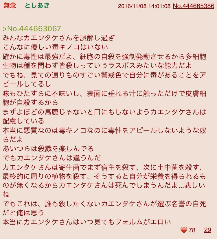 | … | 28626/01/18(日)15:53:12No.1393661486+なんでキノコってこんだけ強い毒持ってるんだろ? |