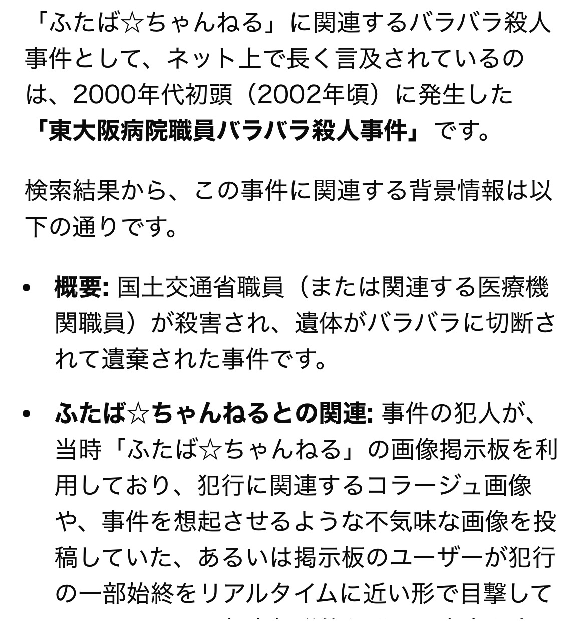 | … | 4426/01/18(日)19:52:04No.1393752658そうだねx2>2008年の事件なのにAI要約鵜呑みにしてる子が多すぎる… |