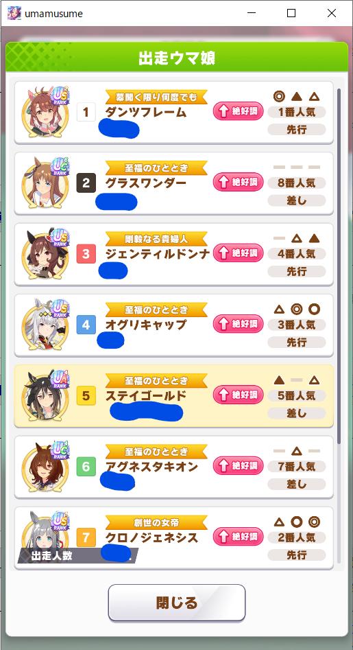 | … | 16426/01/18(日)21:11:41 ID:vgaxeoE2No.1393786896+今回先行がつよつよですが差しか追込を1人混ぜておいた方が良さそうなんですよね |